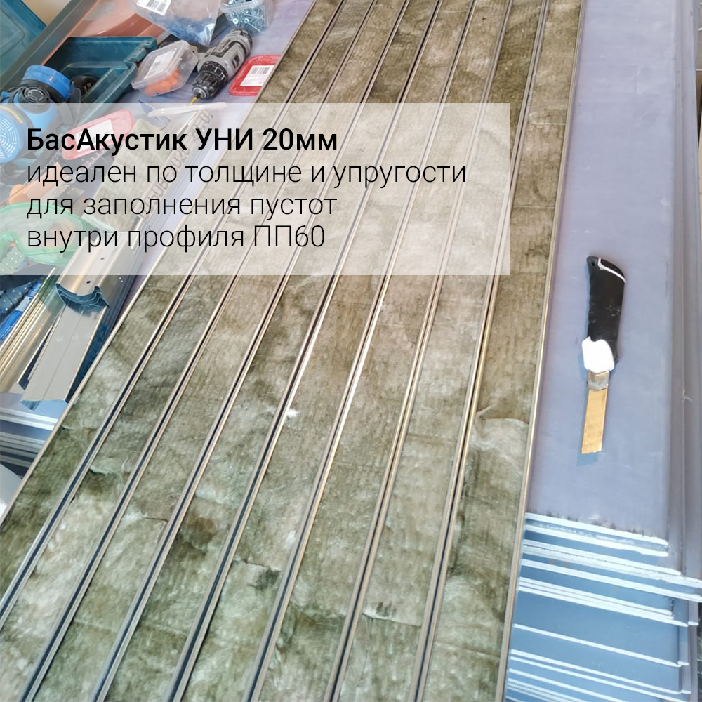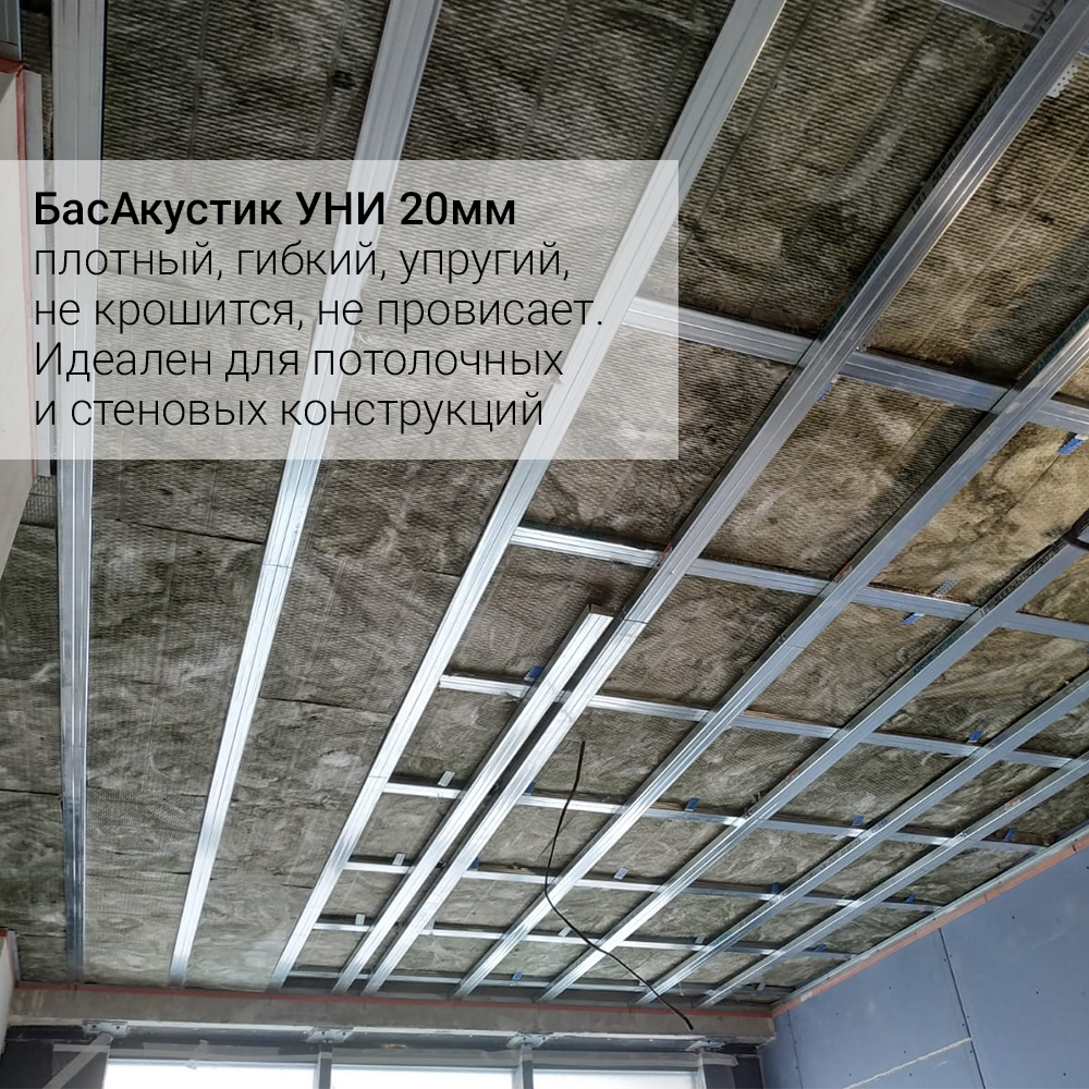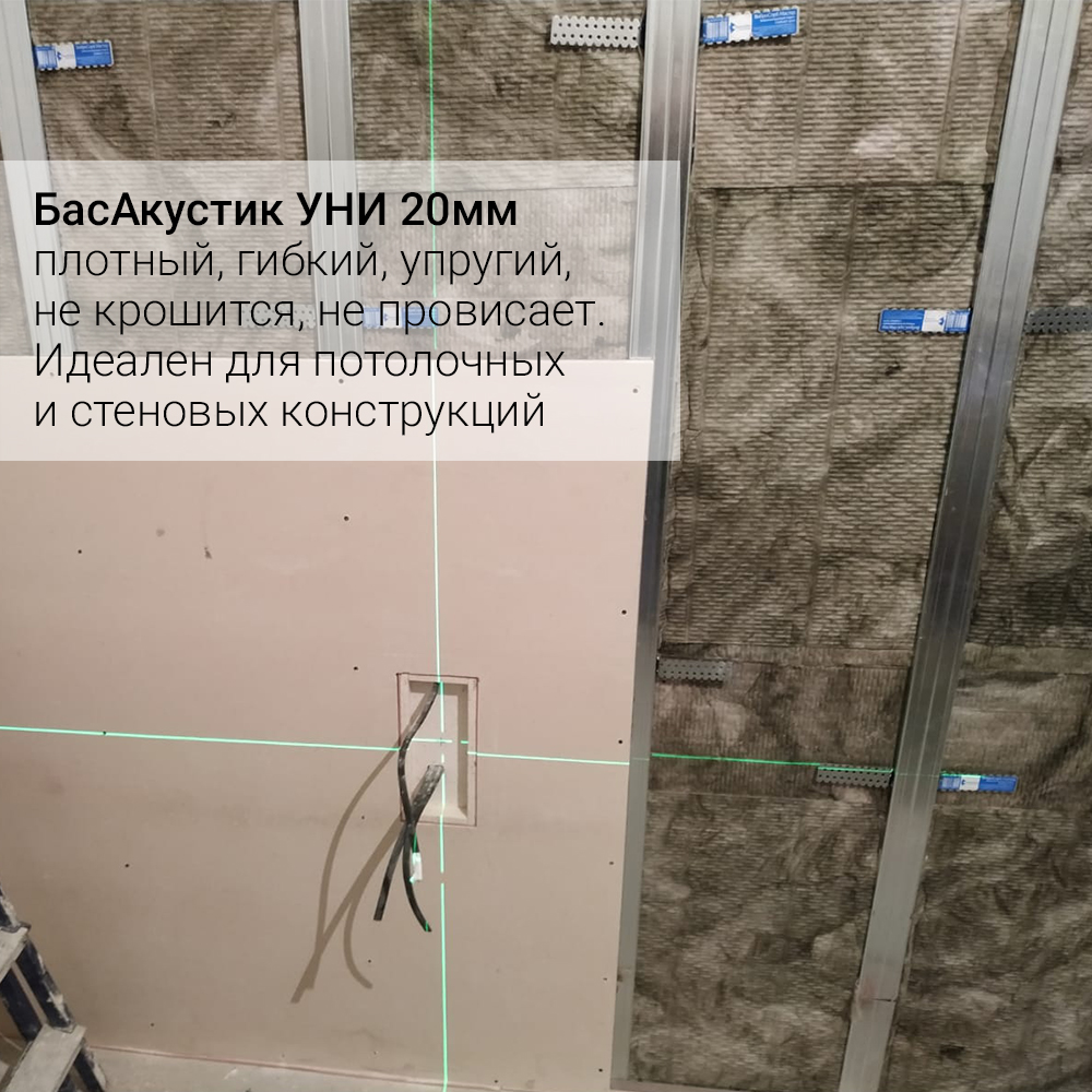 Плита БасАкустик УНИ – Самая эффективная в своем классе звукопоглощающая плита, благодаря структуре и плотности поглощает звуковые волны во всем диапазоне частот. Плита универсальна, её можно использовать в конструкциях звукоизолирующих облицовок стен, потолка, каркасных перегородках в качестве заполнителя, а так же в конструкция пола по лагам, а так же сборные стяжки и стяжки цементно-песчаные армированные.