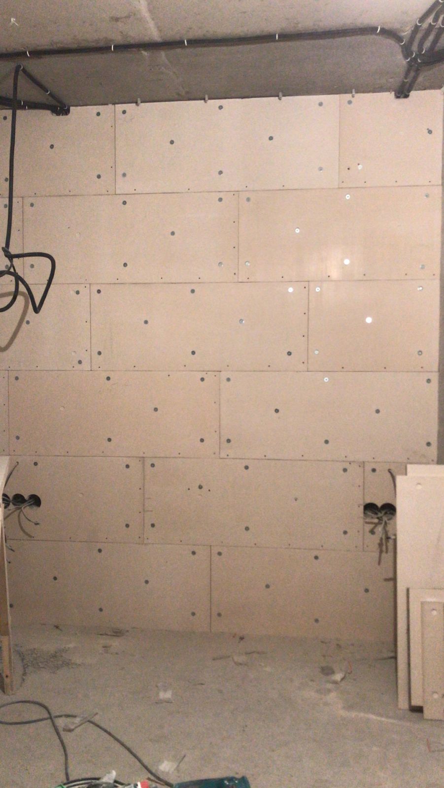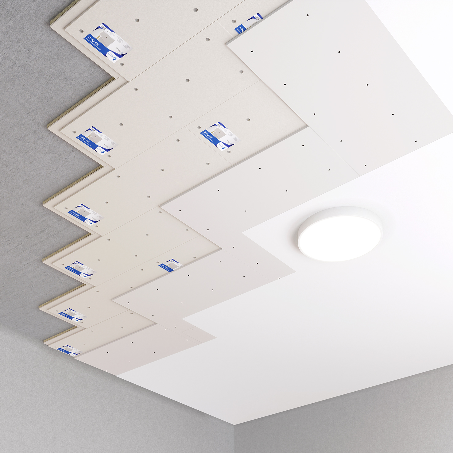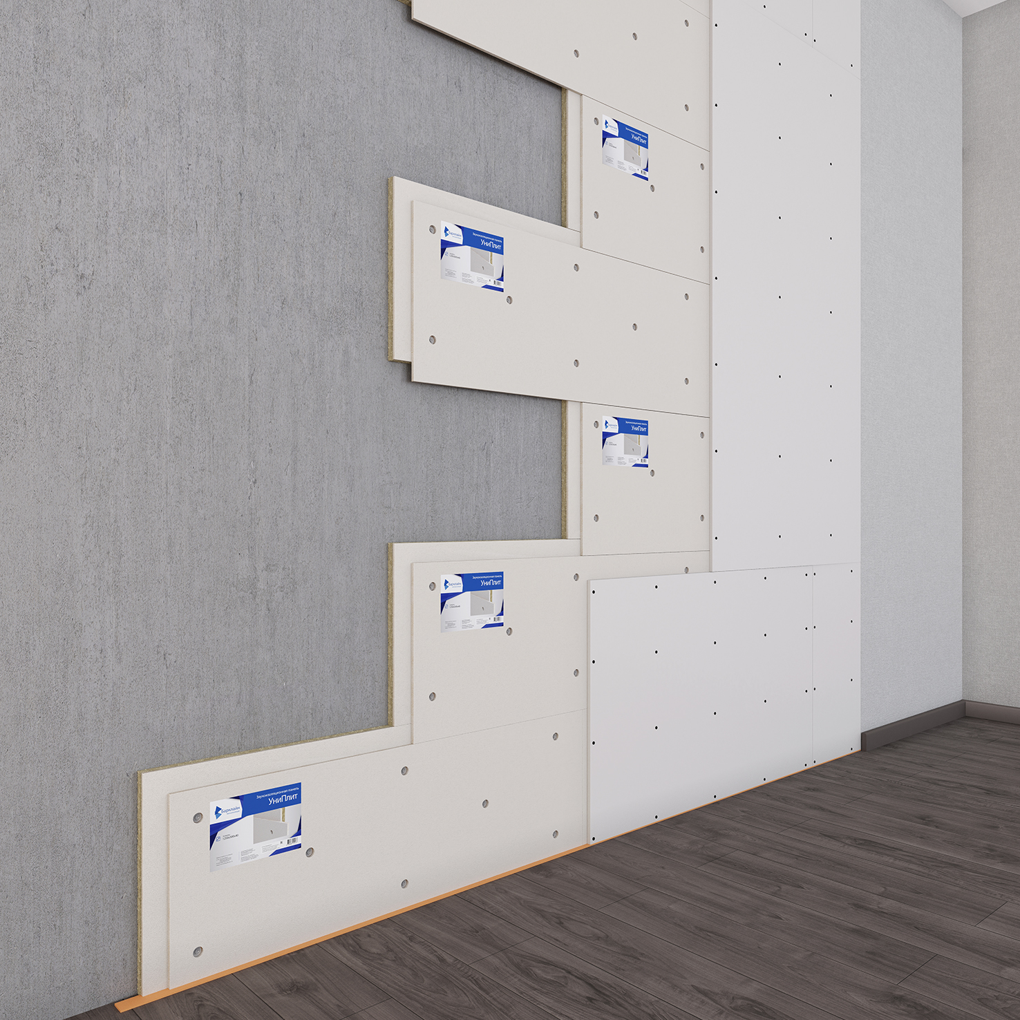 Панель УниПлит 40 – высокоэффективная панель для однослойной, бескаркасной звукоизоляционной облицовки стен, потолка, внутри помещений. Монтируется бескаркасным способом на основания. Крепеж в стены и в потолочное перекрытие используется разный. Замки панелей скрепляются герметиком ВиброСорб и саморезами для УниПлит 19мм. Звукоизоляция в два слоя, просто прикрепите панели, и облицуйте их одним слоем ГКЛ 12,5мм.