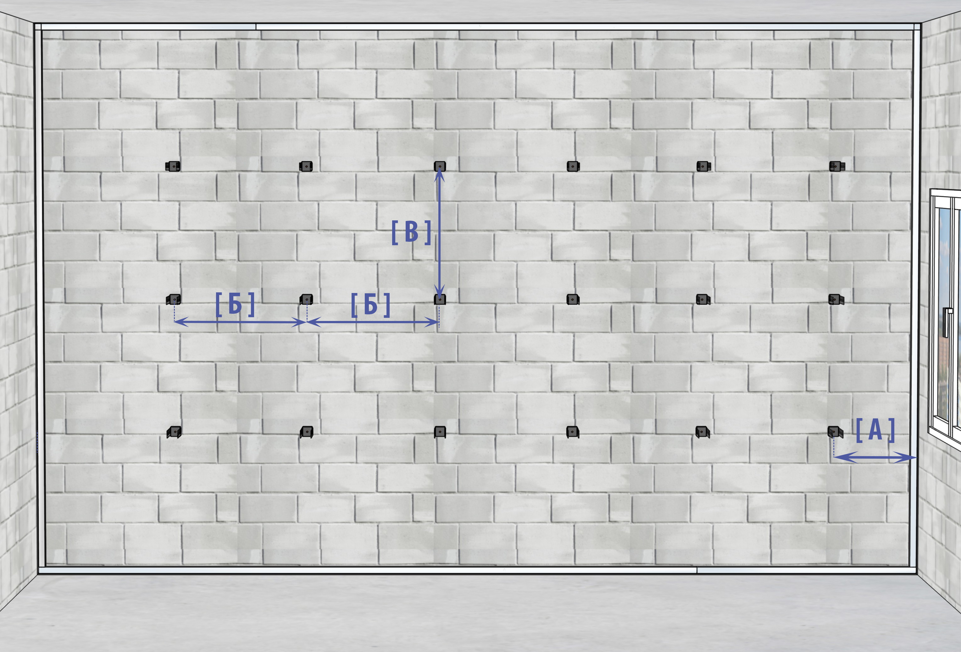 [В] - между подвесами 400-900мм(при высоте 2.4м нужно 3 подвеса.