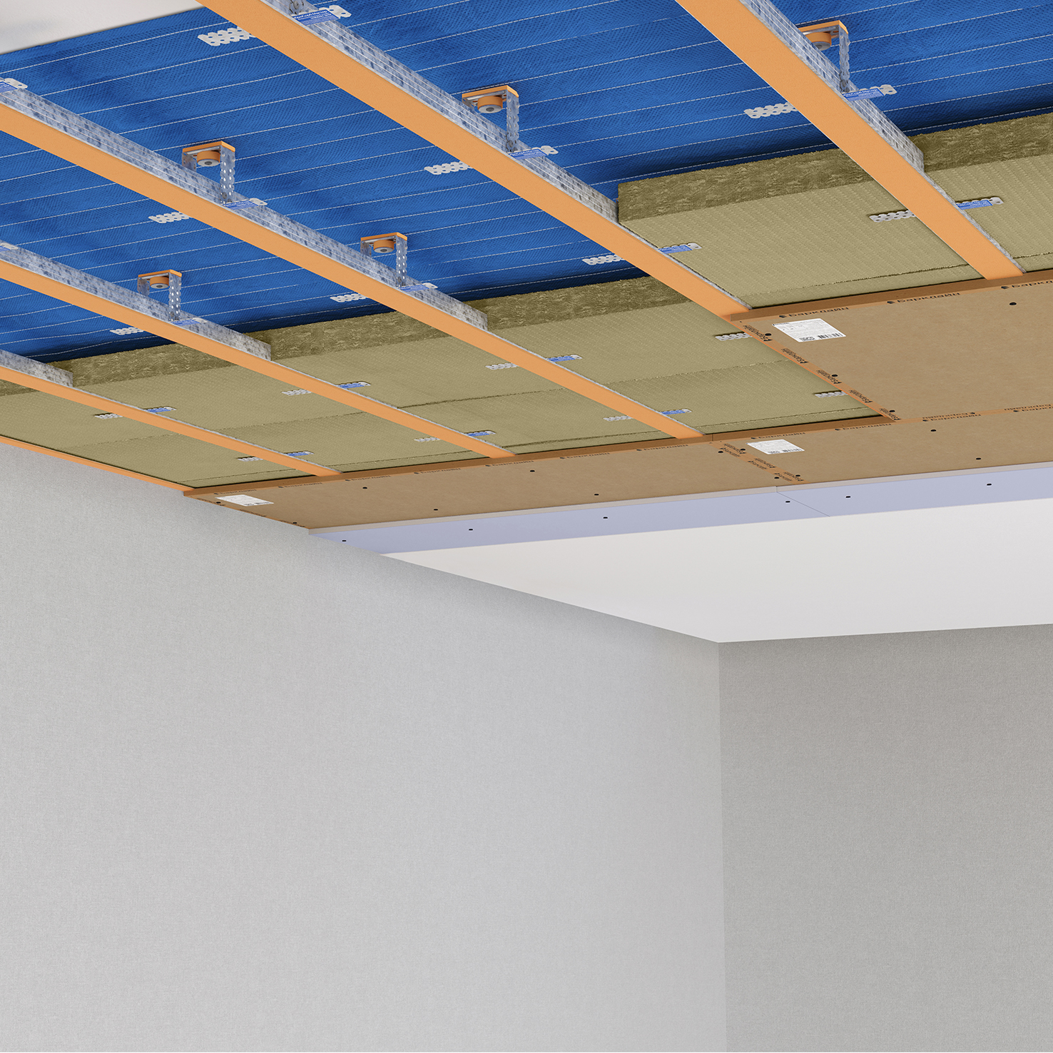 Каркасная шумоизоляция потолка эффективно сохраняет акустический комфорт в квартирах и офисах. Идеально подходит для виброизоляции и звукоизоляции от внешнего и ударного шума.
