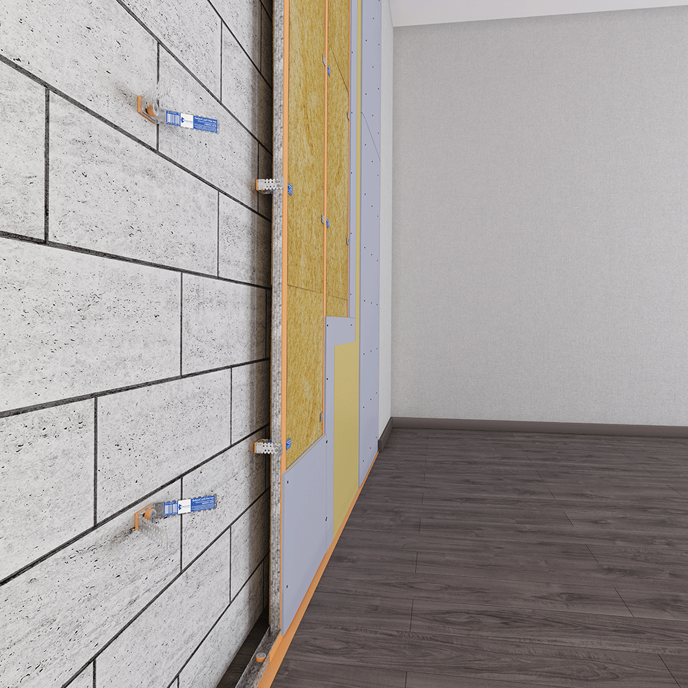 Система начинается с монтажа металлического каркаса (обычно из профилей CD и UD), который крепится к стене. Это основа всей конструкции, обеспечивающая необходимую жесткость и стабильность.