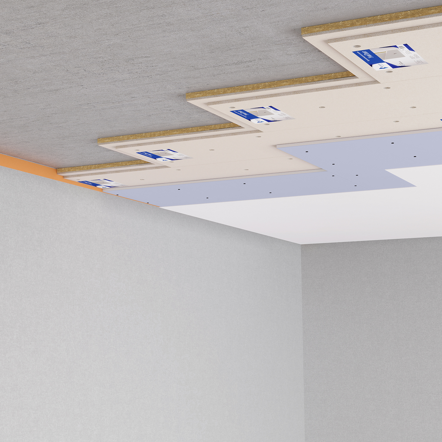 Бескаркасная система звукоизоляции под натяжные потолки.В системе два слоя : звукоизоляционная панель УниПлит 40мм и финишный слой акустический гипсокартон 12.5мм Финишный потолок - натяжное полотно.