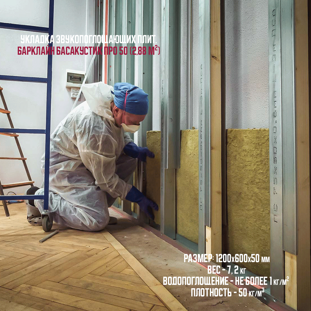 3. Формирование звукопоглощающего слоя: внутрь профиля помещают звукопоглощающие плиты Барклайн БасАкустик ПРО 50 (2,88 м2), которые поглощают звуковые волны во всем диапазоне частот, снижают передачу вибраций и улучшают качество изоляции от шума.