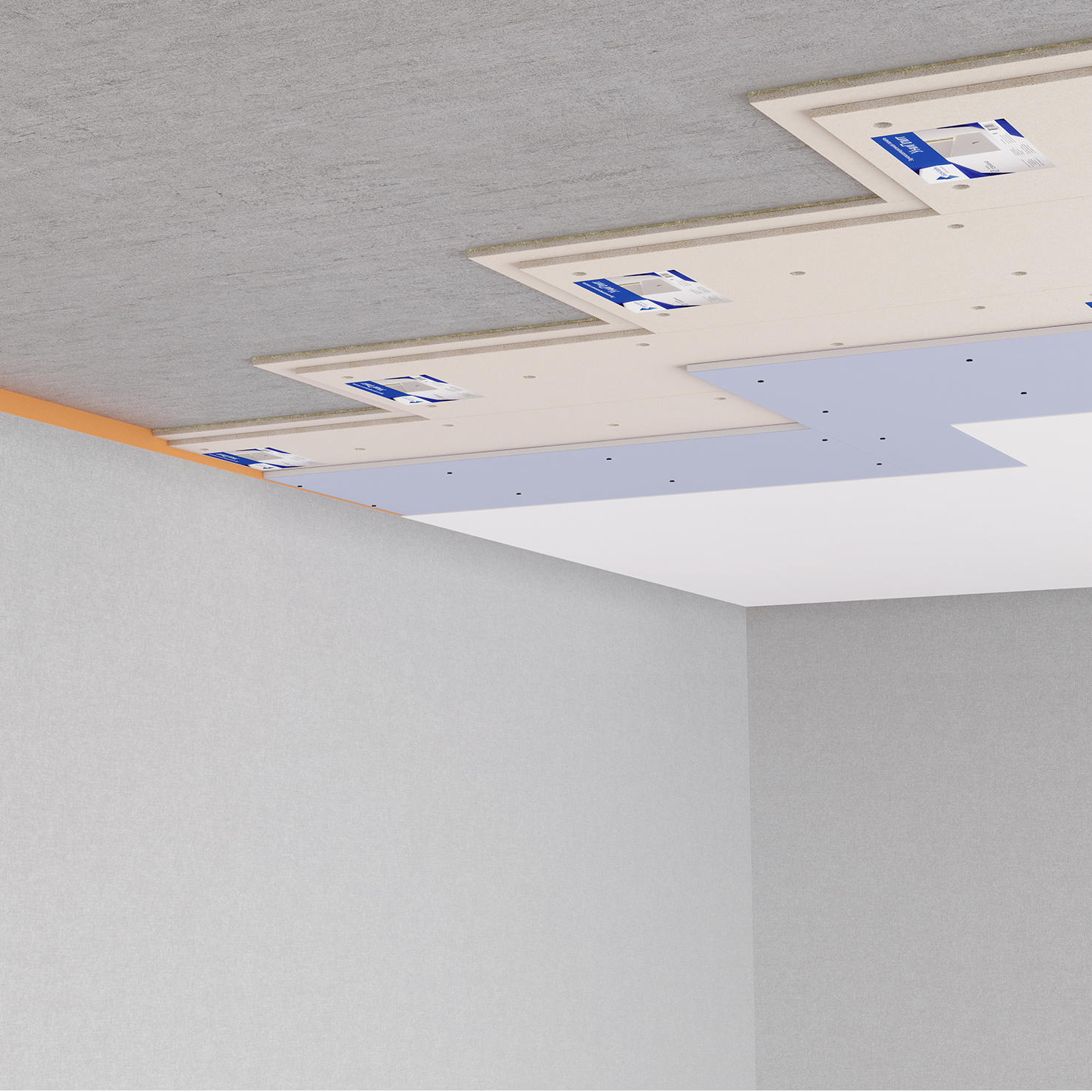 Бескаркасная шумоизоляция для натяжных потолков которая монтируется сразу на перекрытие. В системе два слоя : звукоизоляционная панель УниПлит 24мм и финишный слой акустический гипсокартон 12.5мм Финишный потолок - натяжное полотно.